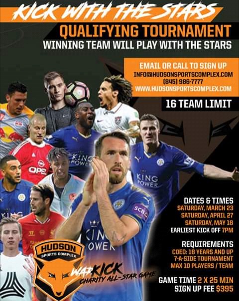 Kick With The Stars Qualifying Tournament This is your once in a lifetime chance to play with the stars from the Premier League, MLS and European Top Leagues. www.hudsonsportscomplex.com/events-1/kick-with-the-stars-qualifying-tournament?fbclid=IwAR0MtTM7kLwByFPX0Q0nwlKtATvH6AprmNvswCSEwCb45tXxBBUIlvl6pkk